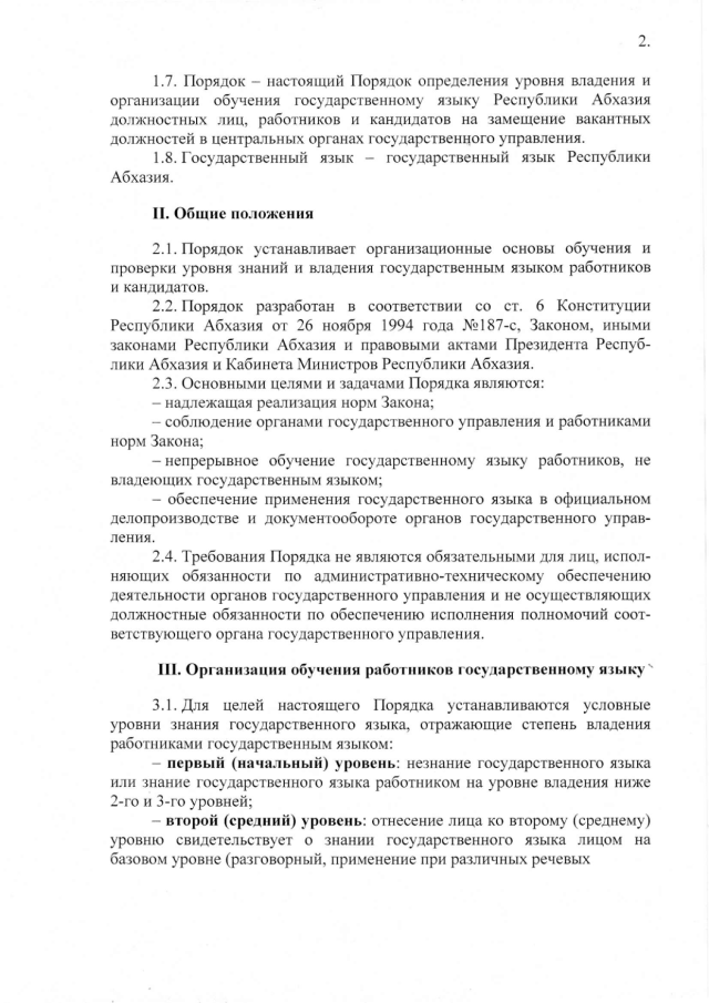 Постановление Кабинета Министров Республики Абхазия от 28.09.2018 № 138 "Об утверждении "Порядка определения уровня владения и организации обучения государственному языку Республики Абхазия должностных лиц, работников и кандидатов на замещение вакантных должностей в центральных органах государственного управления"