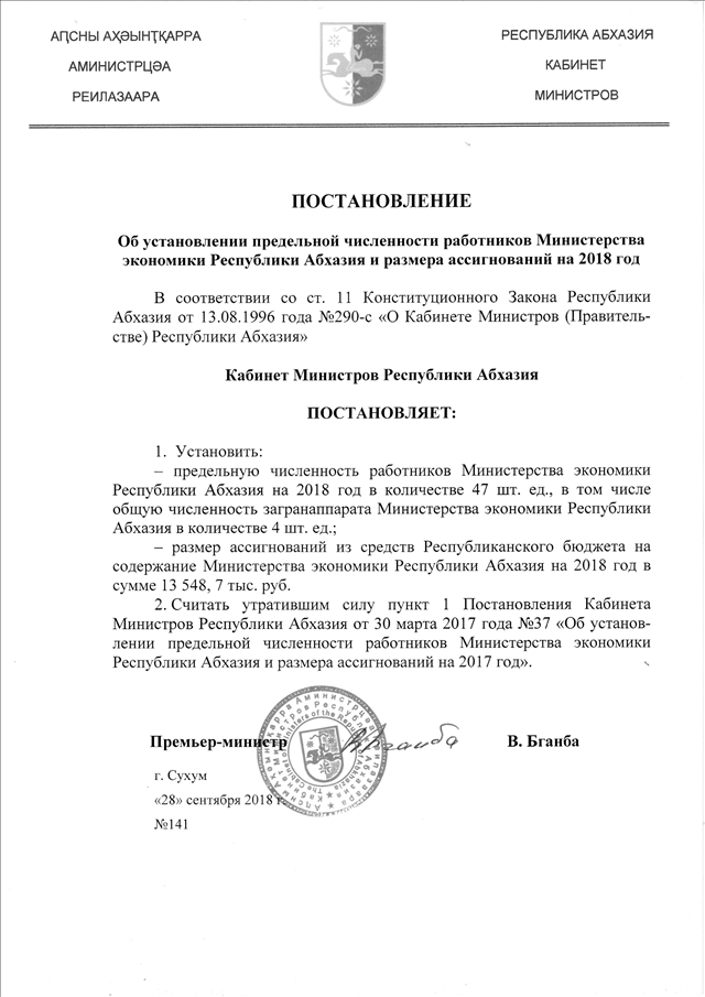 Постановление Кабинета Министров Республики Абхазия от 28.09.2018 № 141 "Об установлении предельной численности работников Министерства экономики Республики Абхазия и размера ассигнований на 2018 год"