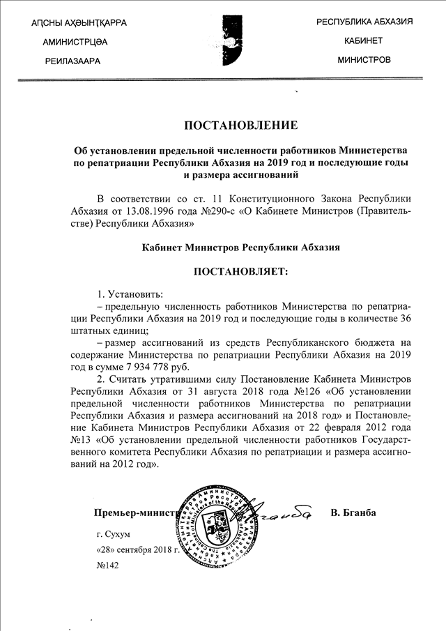 Постановление Кабинета Министров Республики Абхазия от 28.09.2018 № 142 "Об установлении предельной численности работников Министерства по репатриации Республики Абхазия на 2019 год и последующие годы и размера ассигнований"