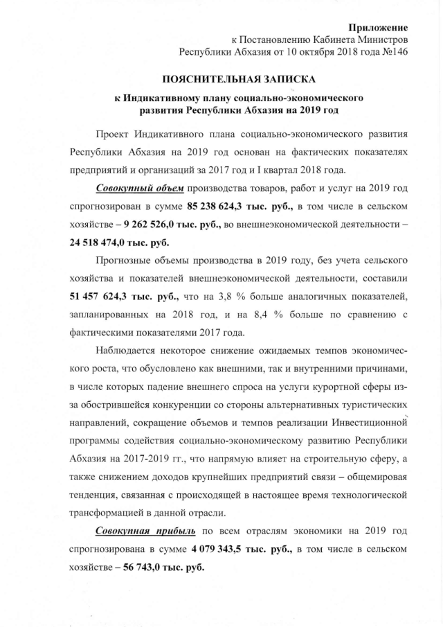 Постановление Кабинета Министров Республики Абхазия от 10.10.2018 № 146 "Об утверждении "Индикативного плана социально-экономического развития Республики Абхазия на 2019 год"