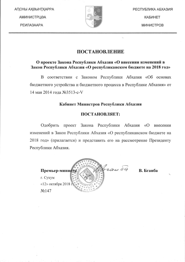 Постановление Кабинета Министров Республики Абхазия от 12.10.2018 № 147 "О проекте Закона Республики Абхазия "О внесении изменений в Закон Республики Абхазия "О республиканском бюджете на 2018 год"