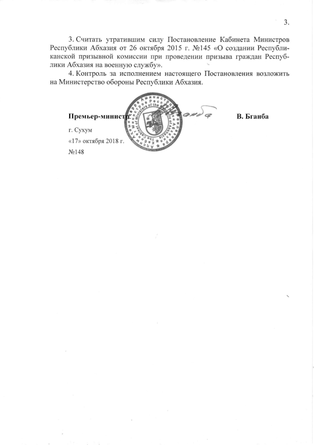 Постановление Кабинета Министров Республики Абхазия от 17.10.2018 № 148 "О создании Республиканской призывной комиссии при проведении призыва градодан Республики Абхазия на военную службу"