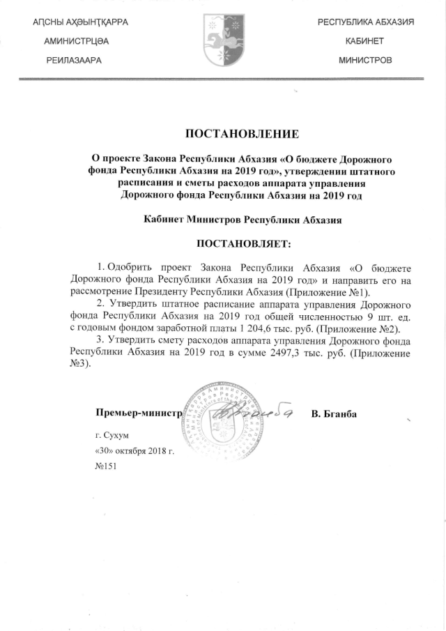 Постановление Кабинета Министров Республики Абхазия от 30.10.2018 № 151 "О проекте Закона Республики Абхазия "О бюджете Дорожного фонда Республики Абхазия на 2019 год", утверждении штатного расписания и сметы расходов аппарата управления Дорожного фонда Республики Абхазия на 2019 год"