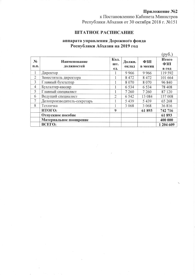 Постановление Кабинета Министров Республики Абхазия от 30.10.2018 № 151 "О проекте Закона Республики Абхазия "О бюджете Дорожного фонда Республики Абхазия на 2019 год", утверждении штатного расписания и сметы расходов аппарата управления Дорожного фонда Республики Абхазия на 2019 год"