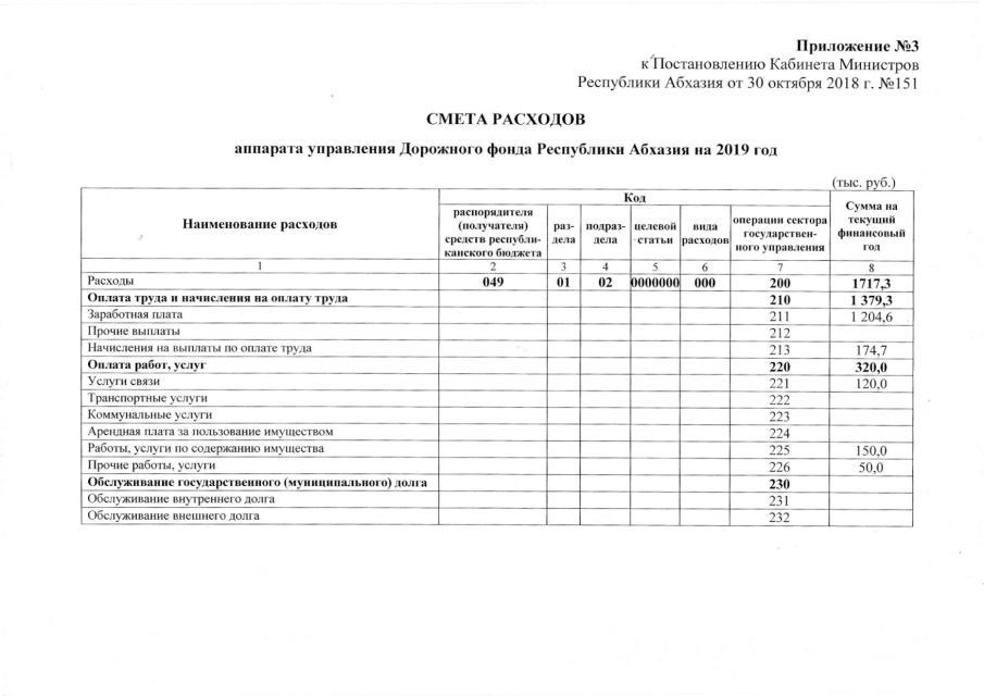 Постановление Кабинета Министров Республики Абхазия от 30.10.2018 № 151 "О проекте Закона Республики Абхазия "О бюджете Дорожного фонда Республики Абхазия на 2019 год", утверждении штатного расписания и сметы расходов аппарата управления Дорожного фонда Республики Абхазия на 2019 год"