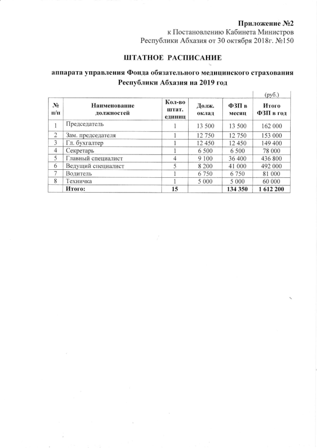 Постановление Кабинета Министров Республики Абхазия от 30.10.2018 № 150 "О проекте Закона Республики Абхазия "О бюджете Фонда обязательного медицинского страхования Республики Абхазия на 2019 год", утверждении штатного расписания и сметы расходов аппарата управления Фонда обязательного медицинского страхования Республики Абхазия на 2019 год"