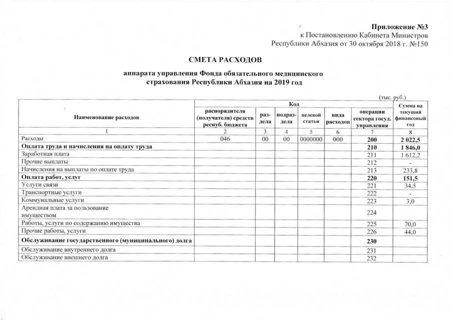 Постановление Кабинета Министров Республики Абхазия от 30.10.2018 № 150 "О проекте Закона Республики Абхазия "О бюджете Фонда обязательного медицинского страхования Республики Абхазия на 2019 год", утверждении штатного расписания и сметы расходов аппарата управления Фонда обязательного медицинского страхования Республики Абхазия на 2019 год"
