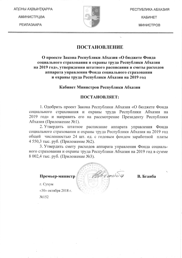 Постановление Кабинета Министров Республики Абхазия от 30.10.2018 № 152 "О проекте Закона Республики Абхазия "О бюджете Фонда социального страхования и охраны труда Республики Абхазия на 2019 год", утверждении штатного расписания и сметы расходов аппарата управления Фонда социального страхования и охраны труда Республики Абхазия на 2019 год"