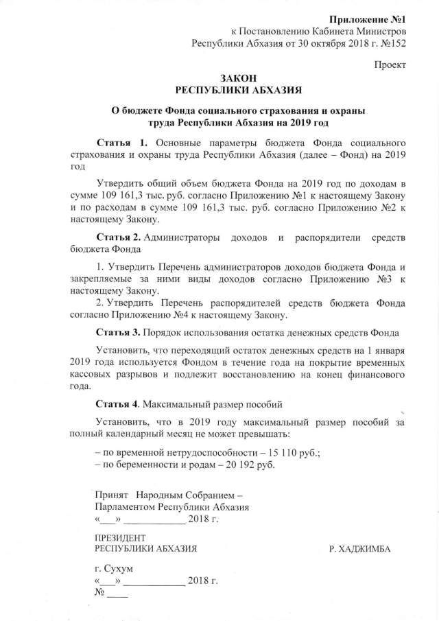Постановление Кабинета Министров Республики Абхазия от 30.10.2018 № 152 "О проекте Закона Республики Абхазия "О бюджете Фонда социального страхования и охраны труда Республики Абхазия на 2019 год", утверждении штатного расписания и сметы расходов аппарата управления Фонда социального страхования и охраны труда Республики Абхазия на 2019 год"