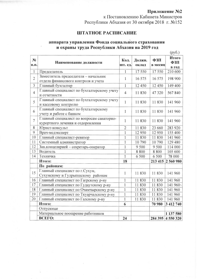 Постановление Кабинета Министров Республики Абхазия от 30.10.2018 № 152 "О проекте Закона Республики Абхазия "О бюджете Фонда социального страхования и охраны труда Республики Абхазия на 2019 год", утверждении штатного расписания и сметы расходов аппарата управления Фонда социального страхования и охраны труда Республики Абхазия на 2019 год"