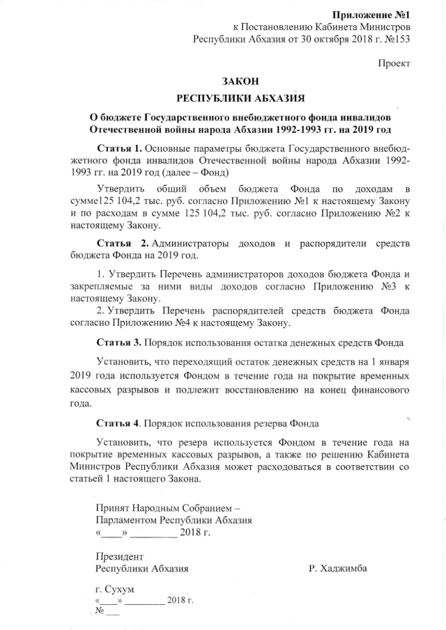 Постановление Кабинета Министров Республики Абхазия от 30.10.2018 № 153 "О проекте Закона Республики Абхазия "О бюджете Государственного внебюджетного фонда инвалидов Отечественной войны народа Абхазии 1992-1993 гг. на 2019 год", утверждении штатного расписания и сметы расходов аппарата управления Государственного внебюджетного фонда инвалидов Отечественной войны народа Абхазии 1992-1993 гг. на 2019 год"