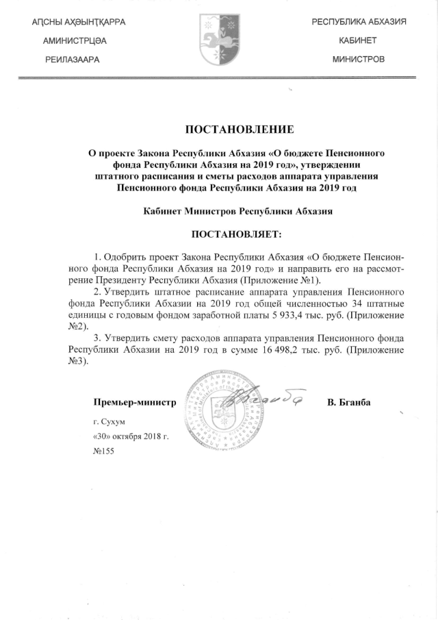 Постановление Кабинета Министров Республики Абхазия от 30.10.2018 № 155 "О проекте Закона Республики Абхазия "О бюджете Пенсионного фонда Республики Абхазия на 2019 год", утверждении штатного расписания и сметы расходов аппарата управления Пенсионного фонда Республики Абхазия на 2019 год"