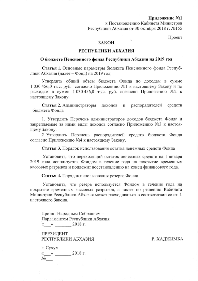 Постановление Кабинета Министров Республики Абхазия от 30.10.2018 № 155 "О проекте Закона Республики Абхазия "О бюджете Пенсионного фонда Республики Абхазия на 2019 год", утверждении штатного расписания и сметы расходов аппарата управления Пенсионного фонда Республики Абхазия на 2019 год"