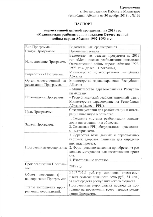 Постановление Кабинета Министров Республики Абхазия от 30.11.2018 № 169 "Об утверждении ведомственной целевой программы на 2019 год "Медицинская реабилитация инвалидов Отечественной войны народа Абхазии 1992-1993 гг."