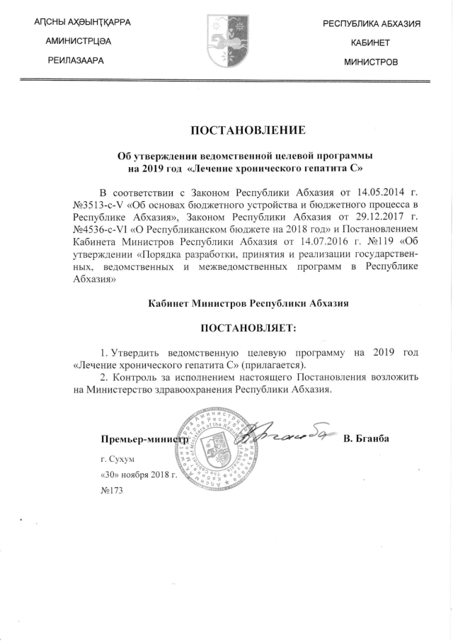 Постановление Кабинета Министров Республики Абхазия от 30.11.2018 № 173 "Об утверждении ведомственной целевой программы на 2019 год "Лечение хронического гепатита С"