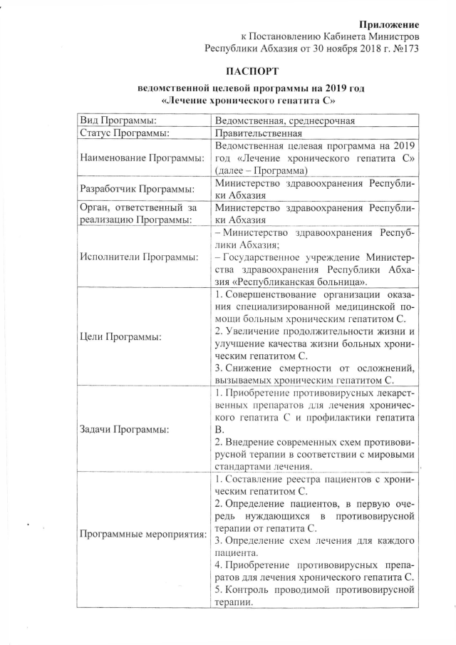 Постановление Кабинета Министров Республики Абхазия от 30.11.2018 № 173 "Об утверждении ведомственной целевой программы на 2019 год "Лечение хронического гепатита С"