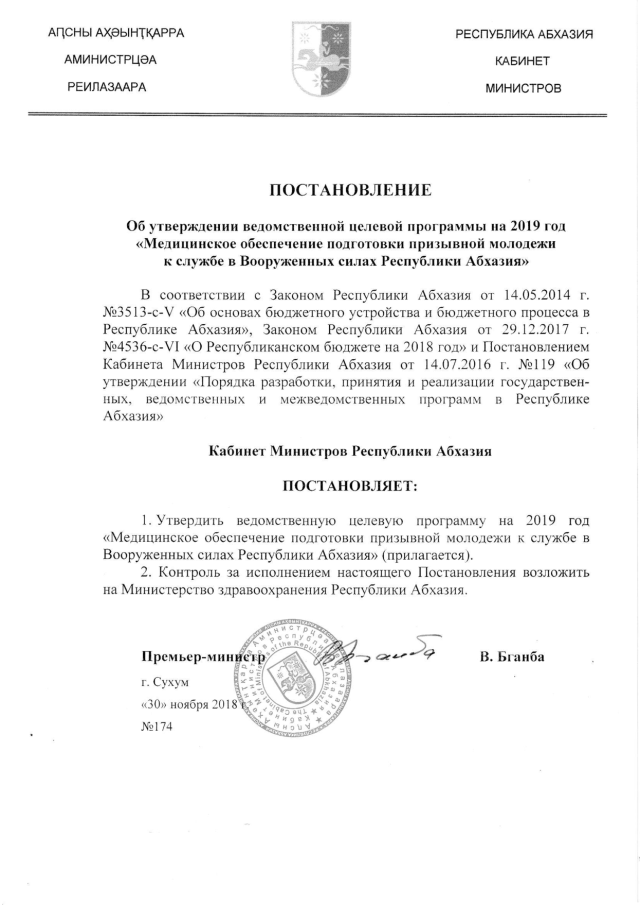 Постановление Кабинета Министров Республики Абхазия от 30.11.2018 № 174 "Об утверждении ведомственной целевой программы на 2019 год "Медицинское обеспечение подготовки призывной молодежи к службе в Вооруженных силах Республики Абхазия"