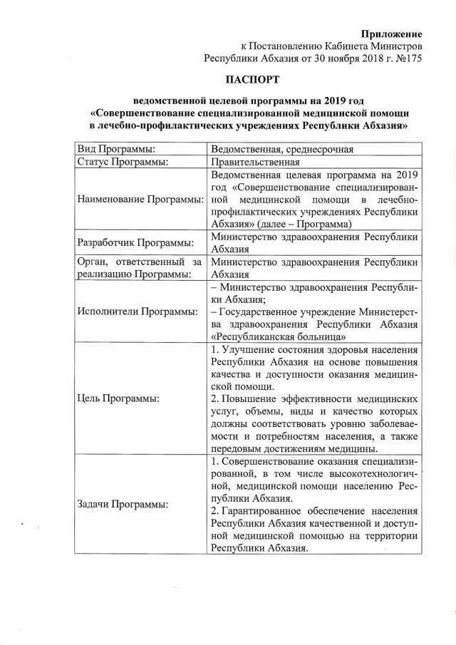 Постановление Кабинета Министров Республики Абхазия от 30.11.2018 № 175 "Об утверждении ведомственной целевой программы на 2019 год "Совершенствование специализированной медицинской помощи в лечебно-профилактических учреждениях Республики Абхазия"