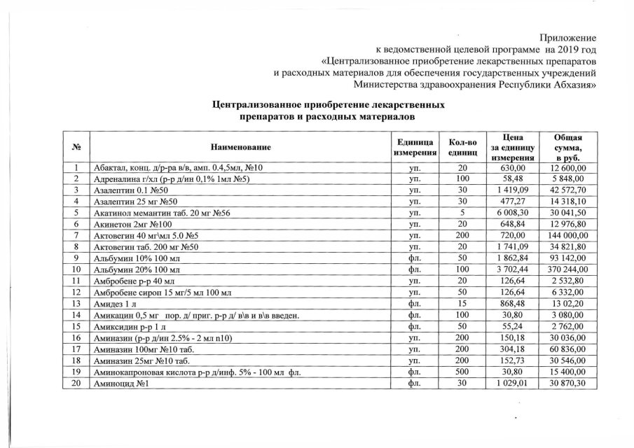 Постановление Кабинета Министров Республики Абхазия от 30.11.2018 № 176 "Об утверждении ведомственной целевой программы на 2019 год "Централизованное приобретение лекарственных препаратов и расходных материалов для обеспечения государственных учревдений Министерства здравоохранения Республики Абхазия"