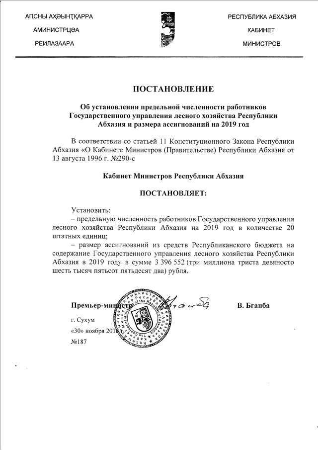 Постановление Кабинета Министров Республики Абхазия от 30.11.2018 № 187 "Об установлении предельной численности работников Государственного управления лесного хозяйства Республики Абхазия и размера ассигнований на 2019 год"