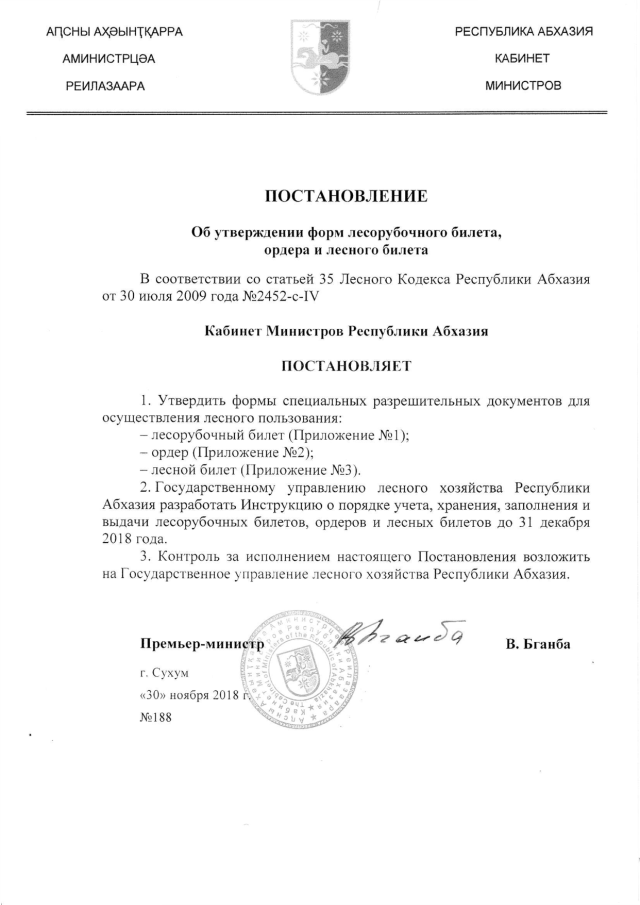 Постановление Кабинета Министров Республики Абхазия от 30.11.2018 № 188 "Об утверждении форм лесорубочного билета, ордера и лесного билета"