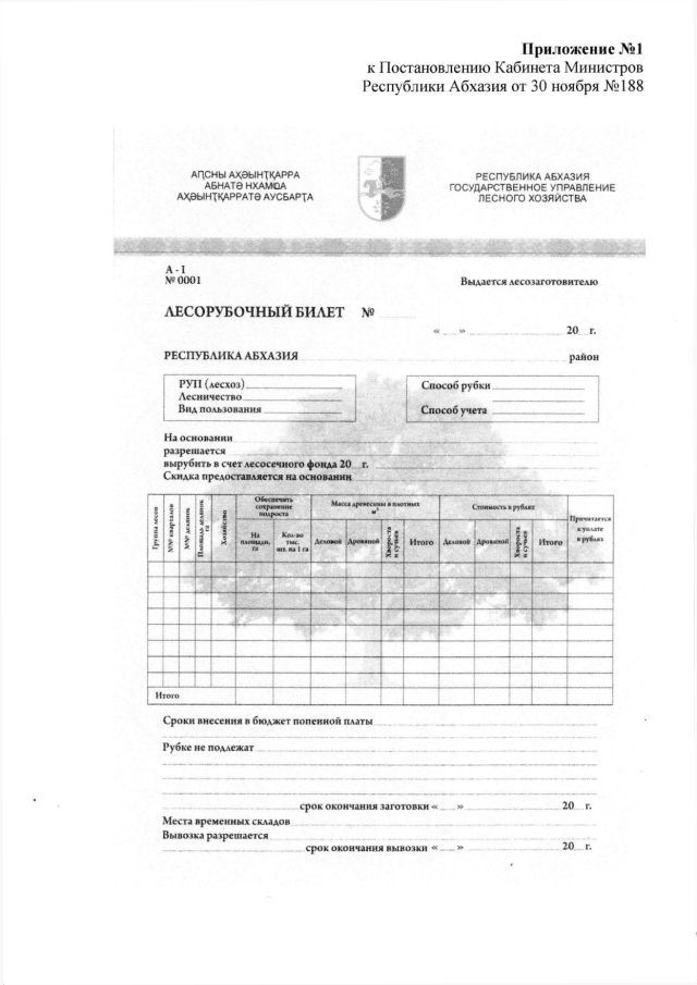Постановление Кабинета Министров Республики Абхазия от 30.11.2018 № 188 "Об утверждении форм лесорубочного билета, ордера и лесного билета"