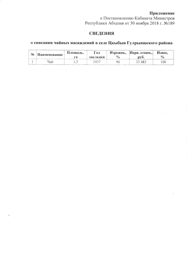 Постановление Кабинета Министров Республики Абхазия от 30.11.2018 № 189 "О списании чайных насаждений в селе Цкыбын Гулрыпшского района"