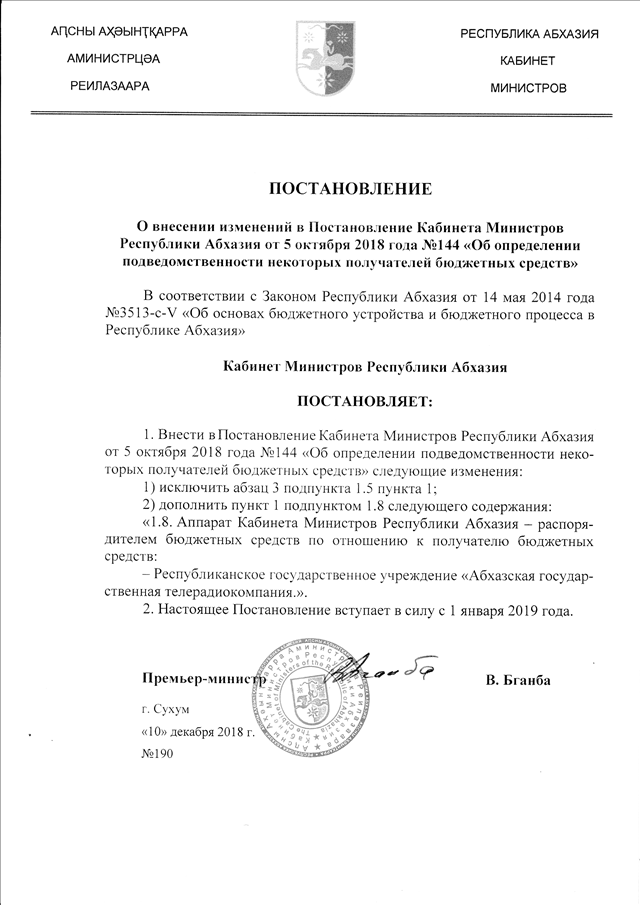 Постановление Кабинета Министров Республики Абхазия от 10.12.2018 № 190 "О внесении изменений в Постановление Кабинета Министров Республики Абхазия от 5 октября 2018 года № 144 "Об определении подведомственности некоторых получателей бюджетных средств"