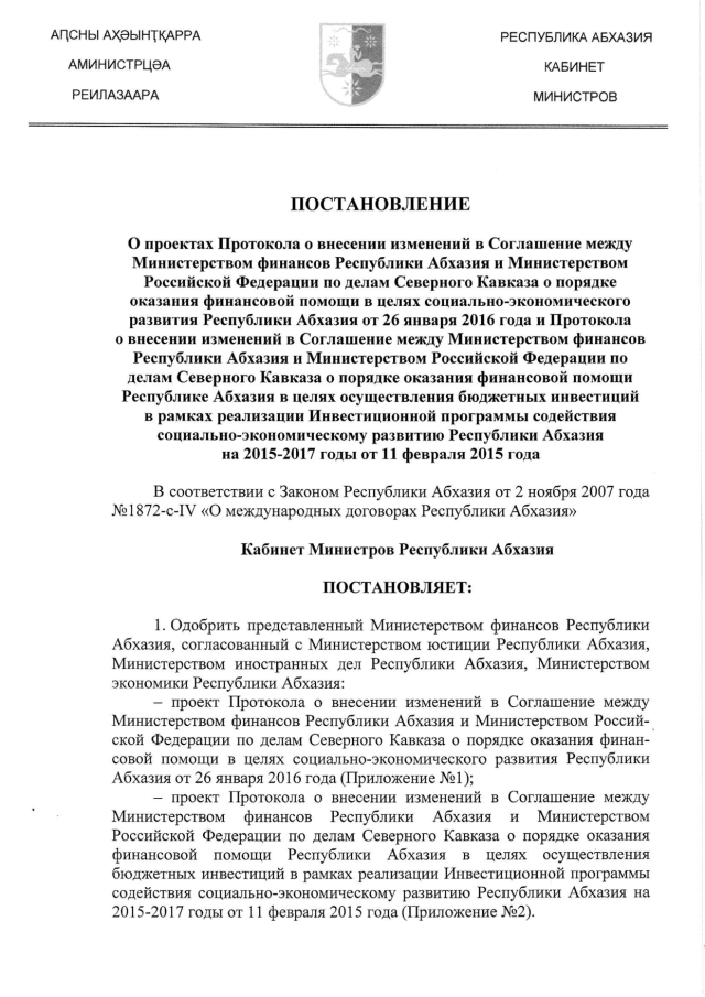 Постановление Кабинета Министров Республики Абхазия от 11.12.2018 № 191 "О проектах Протокола о внесении изменений в Соглашение мевду Министерством финансов Республики Абхазия и Министерством Российской Федерации по делам Северного Кавказа о порядке оказания финансовой помощи в целях социально-экономического развития Республики Абхазия от 26 января 2016 года и Протокола о внесении изменений в Соглашение между Министерством финансов Республики Абхазия и Министерством Российской Федерации по делам Северного Кавказа о порядке оказания финансовой помощи Республике Абхазия в целях осуществления бюджетных инвестиций в рамках реализации Инвестиционной программы содействия социально-экономическому развитию Республики Абхазия на 2015-2017 годы от 11 февраля 2015 года"