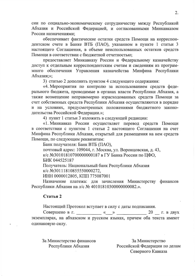 Постановление Кабинета Министров Республики Абхазия от 11.12.2018 № 191 "О проектах Протокола о внесении изменений в Соглашение мевду Министерством финансов Республики Абхазия и Министерством Российской Федерации по делам Северного Кавказа о порядке оказания финансовой помощи в целях социально-экономического развития Республики Абхазия от 26 января 2016 года и Протокола о внесении изменений в Соглашение между Министерством финансов Республики Абхазия и Министерством Российской Федерации по делам Северного Кавказа о порядке оказания финансовой помощи Республике Абхазия в целях осуществления бюджетных инвестиций в рамках реализации Инвестиционной программы содействия социально-экономическому развитию Республики Абхазия на 2015-2017 годы от 11 февраля 2015 года"
