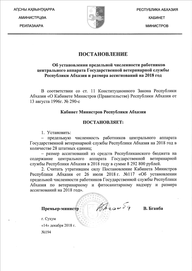 Постановление Кабинета Министров Республики Абхазия от 14.12.2018 № 194 "Об установлении предельной численности работников центрального аппарата Государственной ветеринарной службы Республики Абхазия и размера ассигнований на 2018 год"