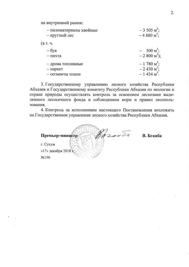 Постановление Кабинета Министров Республики Абхазия от 17.12.2018 № 196 "Об утверждении лесосечного фонда и лесовосстановительных работ в лесах Республики Абхазия на 2019 год"