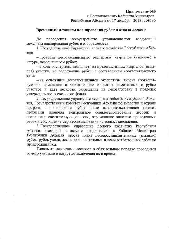 Постановление Кабинета Министров Республики Абхазия от 17.12.2018 № 196 "Об утверждении лесосечного фонда и лесовосстановительных работ в лесах Республики Абхазия на 2019 год"