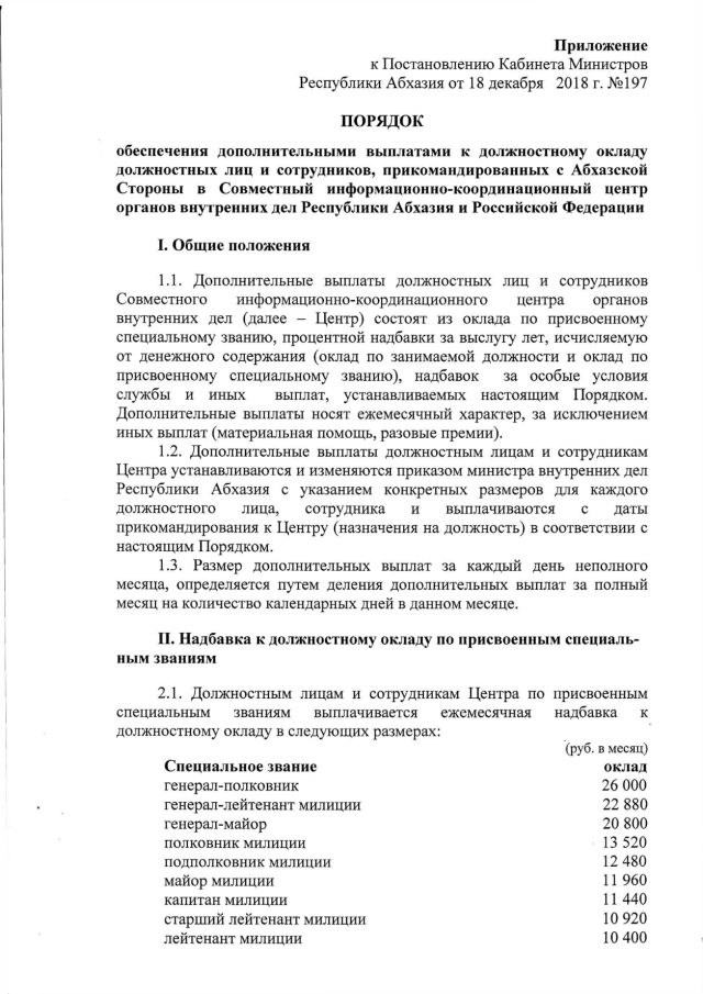 Постановление Кабинета Министров Республики Абхазия от 18.12.2018 № 197 "О Порядке обеспечения дополнительными выплатами к должностному окладу должностных лиц и сотрудников, прикомандированных с Абхазской Стороны в Совместный информационно-координационный центр органов внутренних дел Республики Абхазия и Российской Федерации"