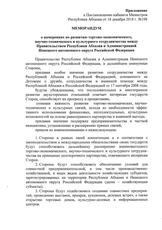 Постановление Кабинета Министров Республики Абхазия от 18.12.2018 № 198 "О подписании Меморандума о намерениях по развитию торгово-экономического, научно-технического и культурного сотрудничества между Правительством Республики Абхазия и Администрацией Ненецкого автономного округа Российской Федерации"