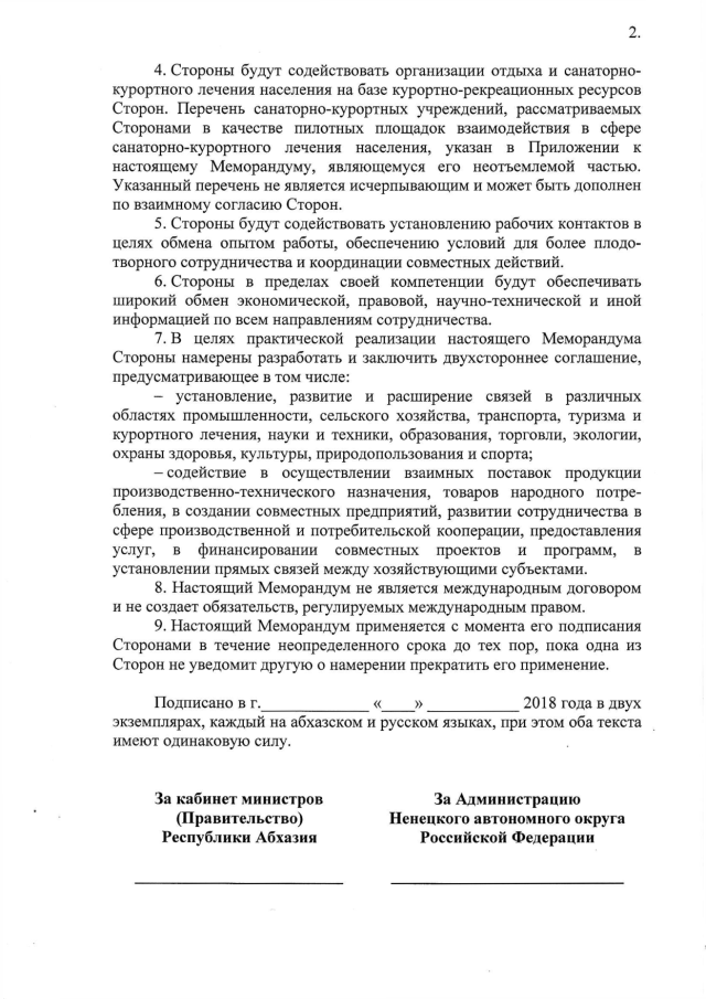 Постановление Кабинета Министров Республики Абхазия от 18.12.2018 № 198 "О подписании Меморандума о намерениях по развитию торгово-экономического, научно-технического и культурного сотрудничества между Правительством Республики Абхазия и Администрацией Ненецкого автономного округа Российской Федерации"