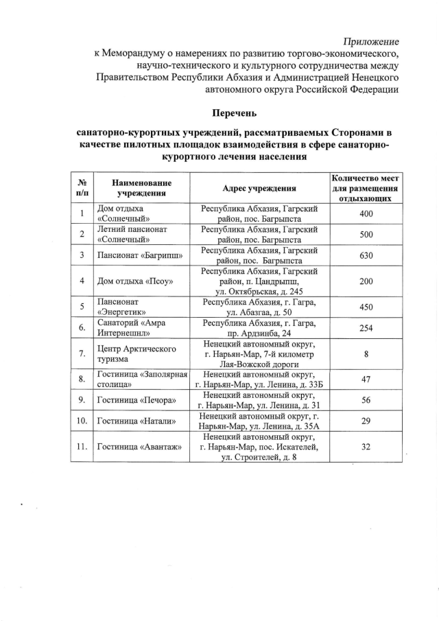 Постановление Кабинета Министров Республики Абхазия от 18.12.2018 № 198 "О подписании Меморандума о намерениях по развитию торгово-экономического, научно-технического и культурного сотрудничества между Правительством Республики Абхазия и Администрацией Ненецкого автономного округа Российской Федерации"