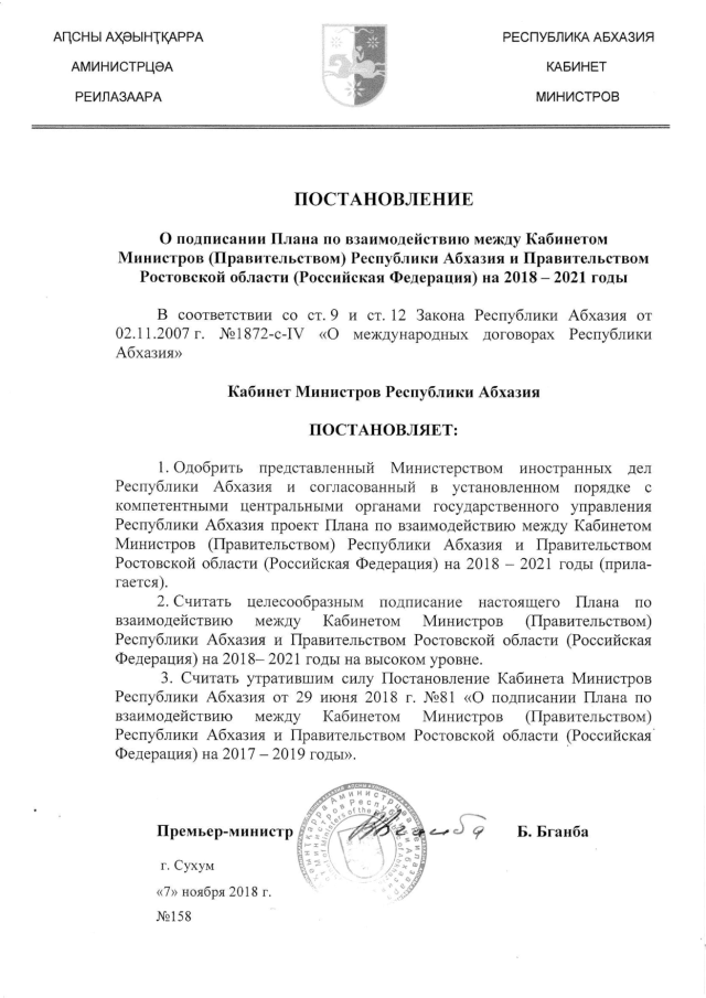 Постановление Кабинета Министров Республики Абхазия от 07.11.2018 № 158 "О подписании Плана по взаимодействию между Кабинетом Министров (Правительством) Республики Абхазия и Правительством Ростовской области (Российская Федерация) на 2018-2021 годы"