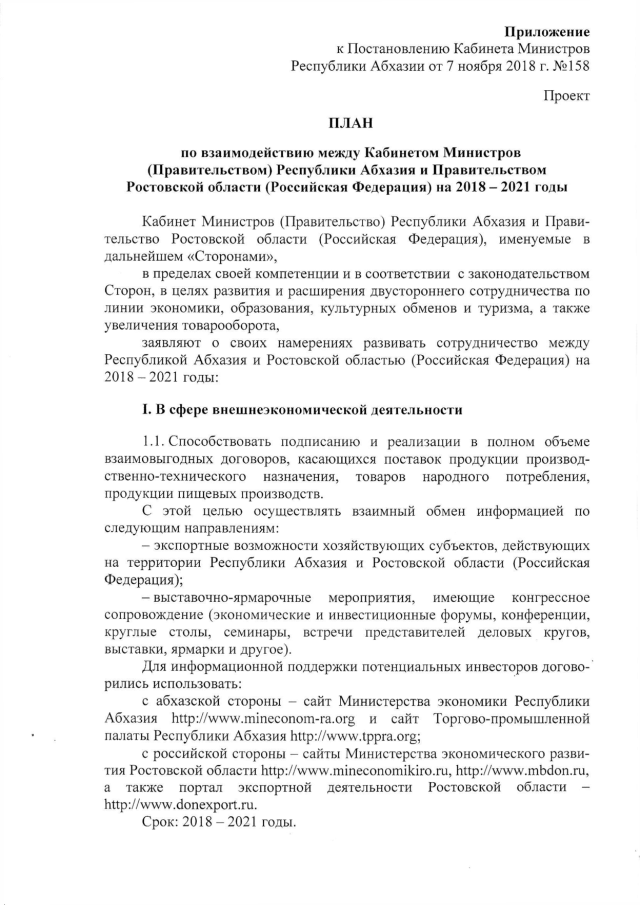 Постановление Кабинета Министров Республики Абхазия от 07.11.2018 № 158 "О подписании Плана по взаимодействию между Кабинетом Министров (Правительством) Республики Абхазия и Правительством Ростовской области (Российская Федерация) на 2018-2021 годы"