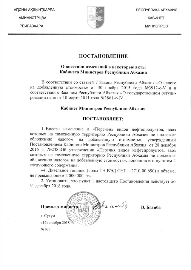 Постановление Кабинета Министров Республики Абхазия от 16.11.2018 № 161 "О внесении изменений в некоторые акты Кабинета Министров Республики Абхазия"