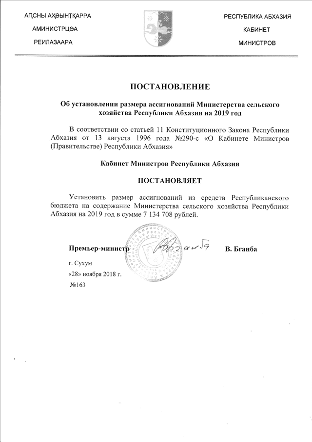 Постановление Кабинета Министров Республики Абхазия от 28.11.2018 № 163 "Об установлении размера ассигнований Министерства сельского хозяйства Республики Абхазия на 2019 год"