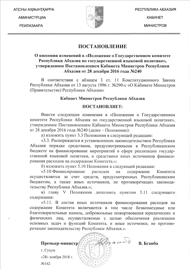 Постановление Кабинета Министров Республики Абхазия от 28.11.2018 № 162 "О внесении изменений в "Положение о Государственном комитете Республики Абхазия по государственной языковой политике", утвержденное Постановлением Кабинета Министров Республики Абхазия от 28 декабря 2016 года № 240"