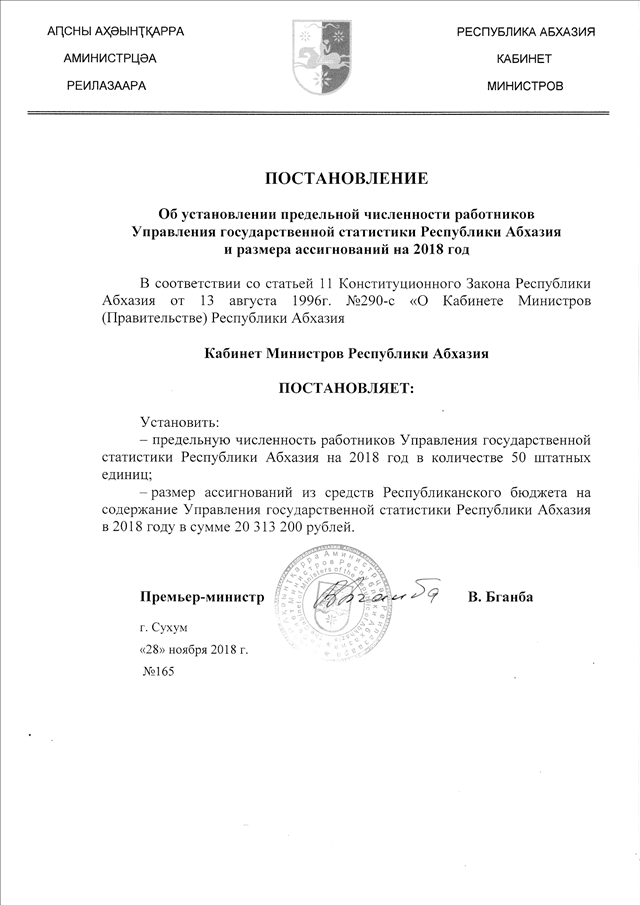 Постановление Кабинета Министров Республики Абхазия от 28.11.2018 № 165 "Об установлении предельной численности работников Управления государственной статистики Республики Абхазия и размера ассигнований на 2018 год"