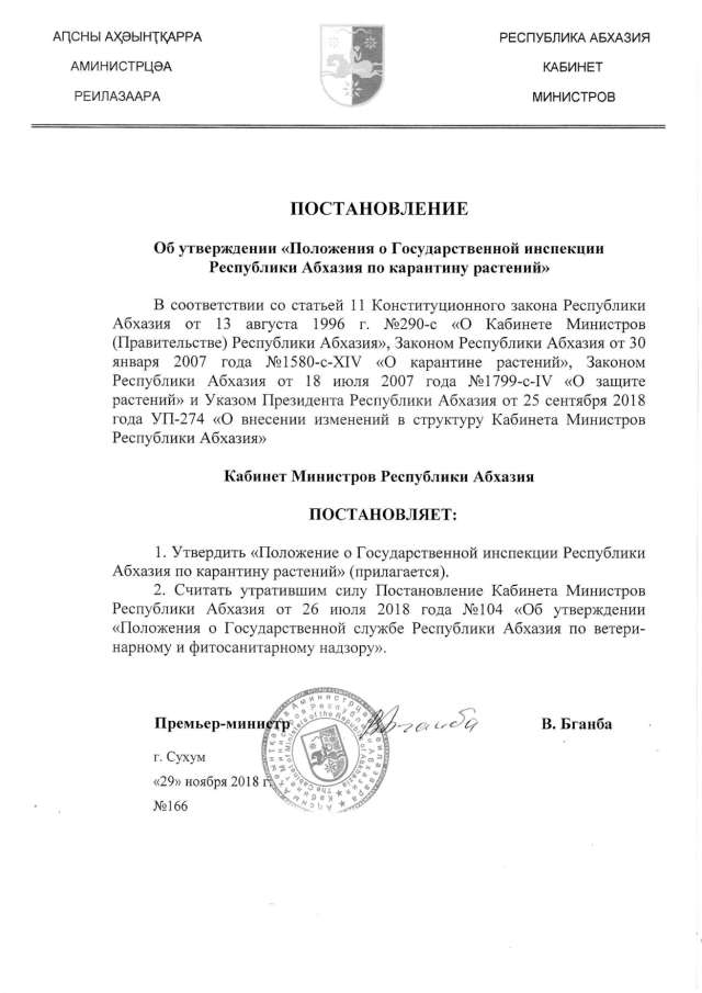 Постановление Кабинета Министров Республики Абхазия от 29.11.2018 № 166 "Об утверждении "Положения о Государственной инспекции Республики Абхазия по карантину растений"