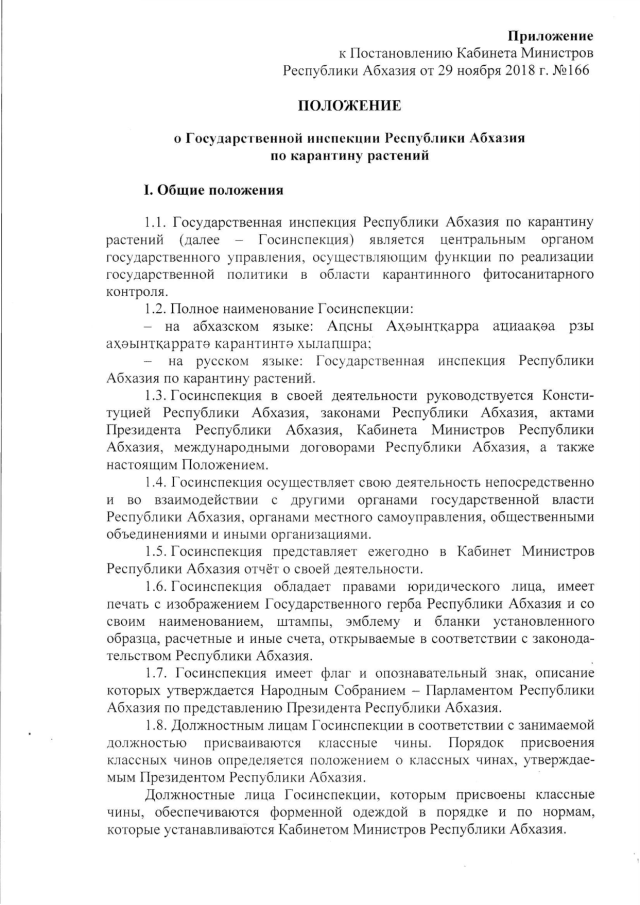 Постановление Кабинета Министров Республики Абхазия от 29.11.2018 № 166 "Об утверждении "Положения о Государственной инспекции Республики Абхазия по карантину растений"