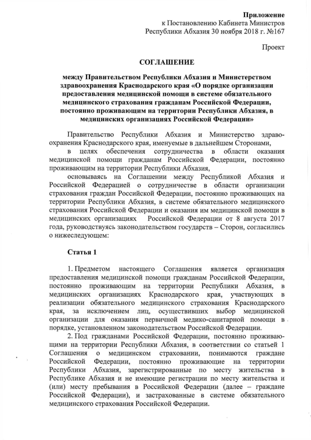Постановление Кабинета Министров Республики Абхазия от 30.11.2018 № 167 "О заключении Соглашения между Правительством Республики Абхазия и Министерством здравоохранения Краснодарского края о порядке организации предоставления медицинской помощи в системе обязательного медицинского страхования гражданам Российской Федерации, постоянно проживающим на территории Республики Абхазия, в медицинских организациях Российской Федерации"