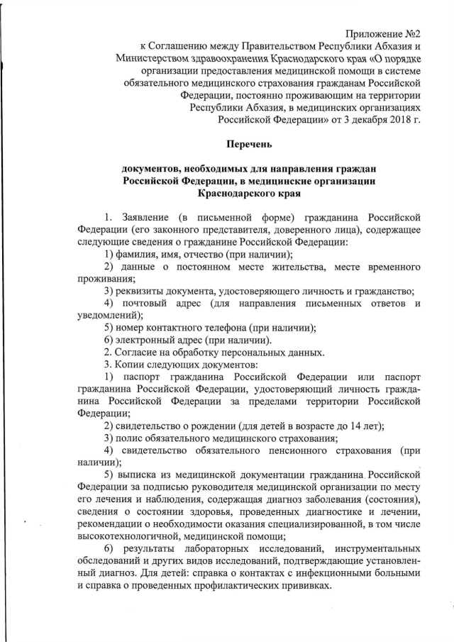 Постановление Кабинета Министров Республики Абхазия от 30.11.2018 № 167 "О заключении Соглашения между Правительством Республики Абхазия и Министерством здравоохранения Краснодарского края о порядке организации предоставления медицинской помощи в системе обязательного медицинского страхования гражданам Российской Федерации, постоянно проживающим на территории Республики Абхазия, в медицинских организациях Российской Федерации"