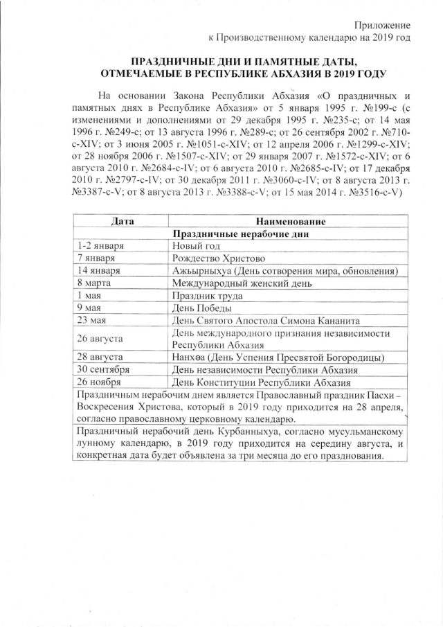 Постановление Кабинета Министров Республики Абхазия от 30.11.2018 № 179 "Об утверждении Производственного календаря на 2019 год"