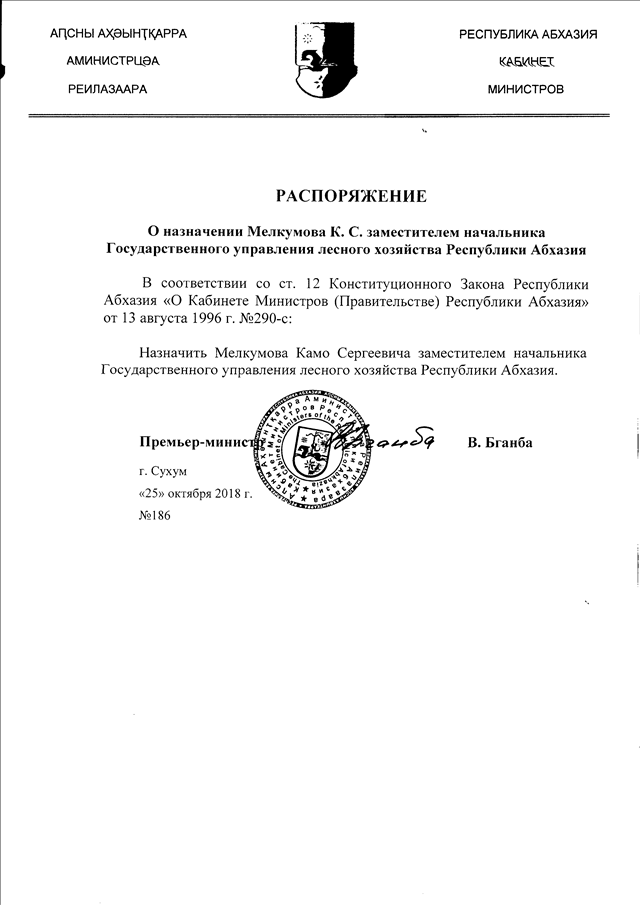 Распоряжение Кабинета Министров Республики Абхазия от 25.10.2018 № 186 "О назначении Мелкумова К.С. заместителе!М начальника Государственного управления лесного хозяйства Республики Абхазия"