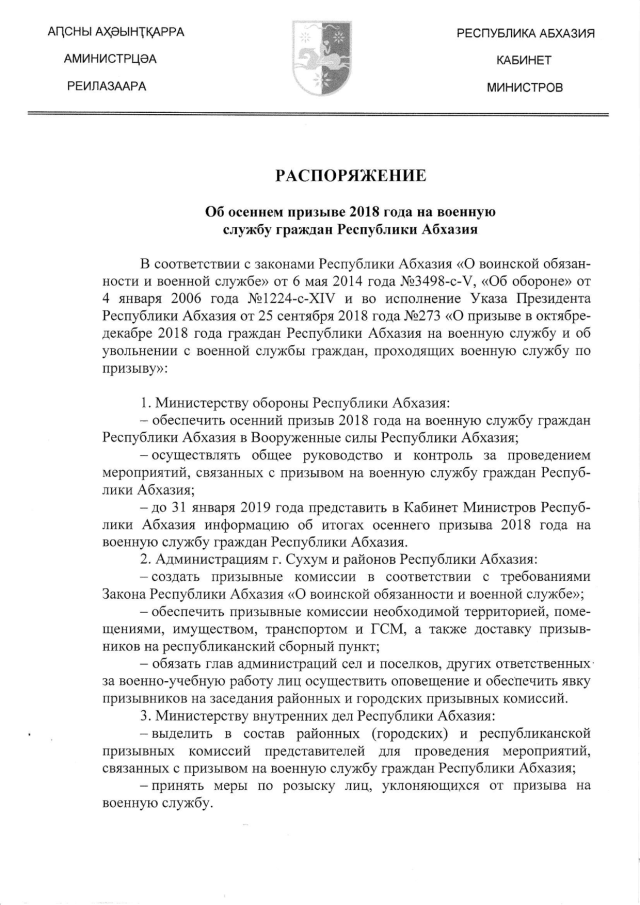 Распоряжение Кабинета Министров Республики Абхазия от 17.10.2018 № 168 "Об осеннем призыве 2018 года на военную службу граждан Республики Абхазия"